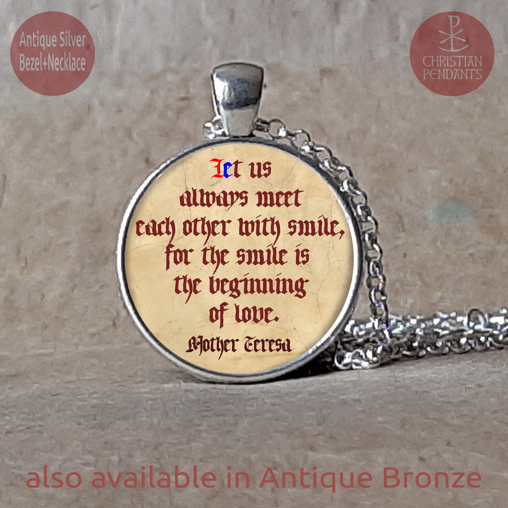 Mother Teresa love quote pendant necklace medallion or keychain: 'Let us always meet each other with smile, for the smile is the beginning of love.' It is printed on photo paper and sealed beneath a glass dome [Ø 25 mm] and fixed at Antique Bronze or Antique Silver circle bezel tray [36x28x3 mm]. It is made into your choice of either a necklace or keychain and packed in a black velvet bag [9x7 cm or 7x5 cm].